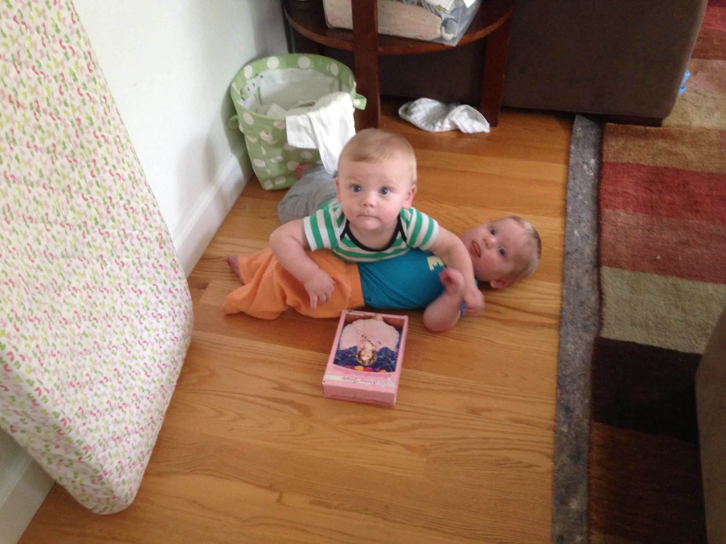 When I say Lochlan is a bruiser, I mean it in a loving way. See, Lochlan has always taking a liking to his older and younger sister. Over the past 2 months, since he’s been crawling, anything in his way is fair game. And I mean everything! Poor Margot is subject to abuse on a regular basis thanks to her brother. As you can see from exhibit “A”, he’s not ashamed. Whether he’s crawling up on Margot’s back or even on top of her head, there is no guilt on that cute face.