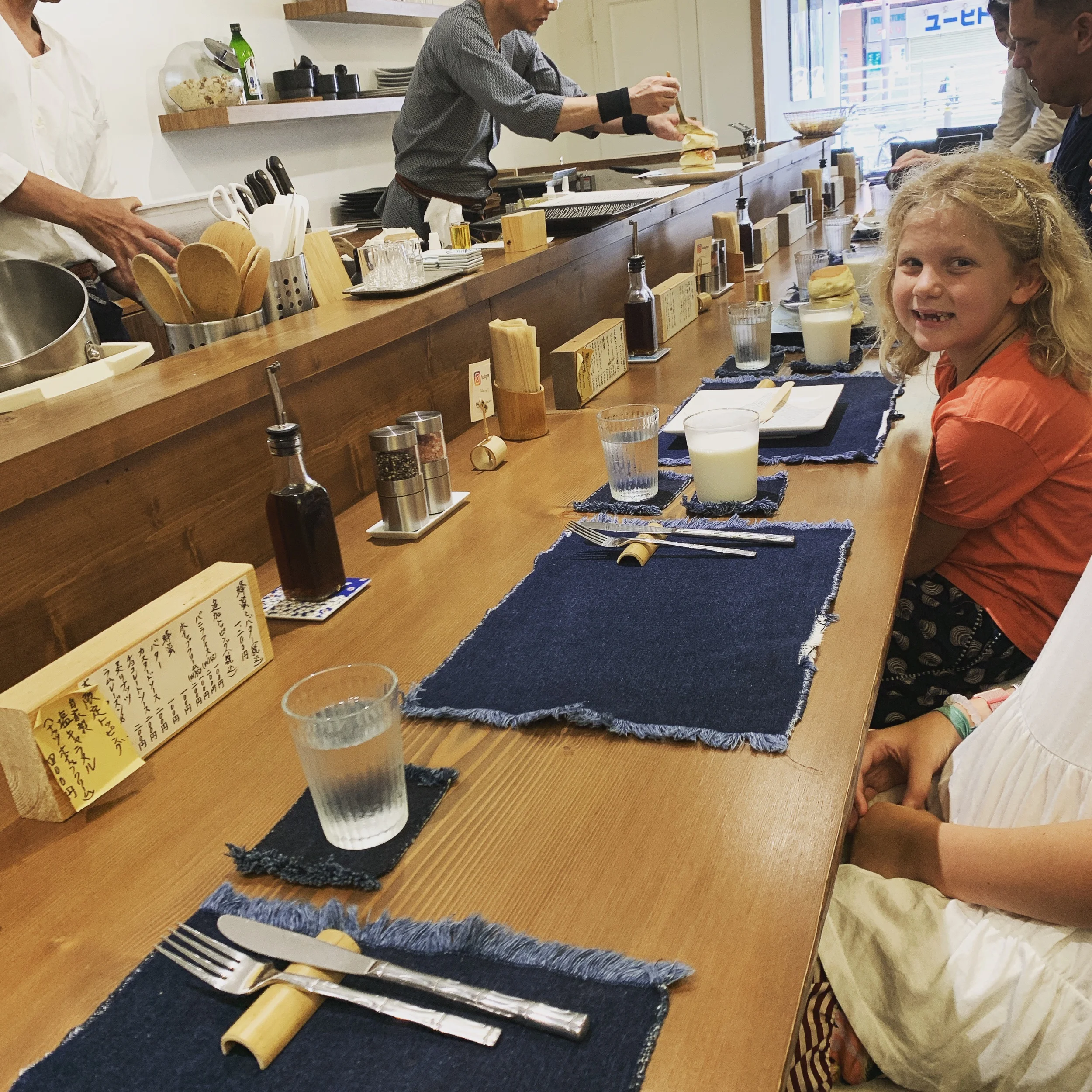 There was one section of the Garden that was of interest. The Ninomaru Garden was a lovely setting to take photos. The Old Castle walls were also a impressive site inside the garden. After the garden tour we hopped on the train and headed Asakusa Station to take kids to another surprise treat. Thanks to Tokyo Zebra we found this great little restaurant called Benitsuru. The chef there makes these amazing thick and fluffy pancakes that are literally mini soufflé’s. They way the shop works is they only take orders in batches of two. One order is made of 3 large pancakes and he only has the ability to make 6 pancakes at a time. Which meant we could only place 4 orders as a family. The girls split a chocolate pancake and the twins split a honey and butter pancake. Clem got a grilled banana nut pancake and I went for the cholesterol mound of a fried egg, bacon and hollandaise pancake. As you ca see from the video, all four were amazing.