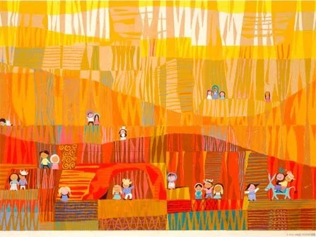 Mary Blair had to have a pane in our home. Blair’s ability to create unique perspective through art and cartoon animation, was the reason our family enjoyed the Small World immensely. Paley was about four when she first visited the magical world of Mary Blair. While the twins were three. My mother was also a great fan of Mary’s work because she grew up with so many of her Golden Books like “I Can Fly”. Even when we were children we had Mary Blair golden books. As I looked through world of Mary Blair books and biographies, I kept seeing one piece of artwork over and over. A piece that would inspire me in the selection process of the remaining two panes for the sun tunnel.