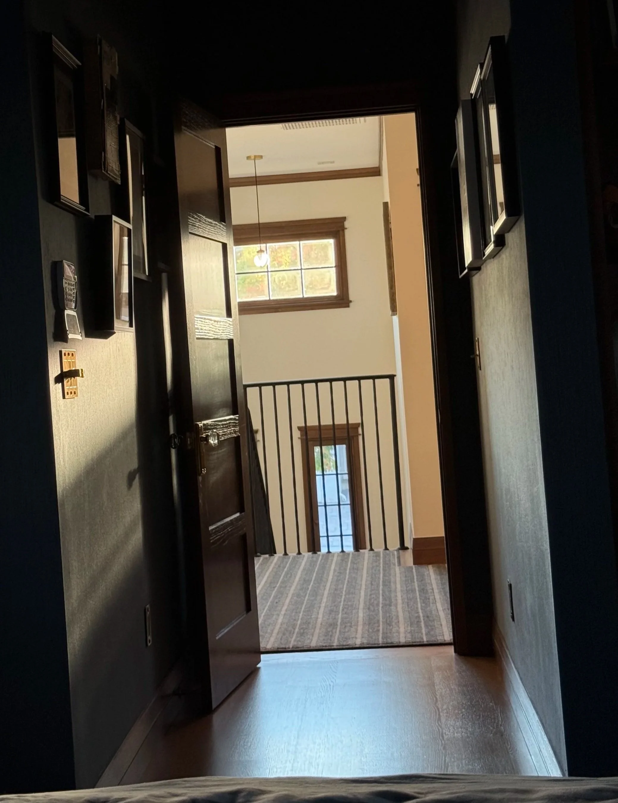 Sitting now on my master bed looking out on to the landing, the light problem was truly was solved by the stained glass ceiling and the channel of windows atop the staircase. The amount of light is not too much l, especially as the light shifts in early evening hours. Included in the post is a image of early evening sunset. The direct sunlight hits the light streaming down the sun tunnels into the big silver Mylar draped hole behind the stained glass window. Red and Purple light can be seen at this early sunset hour and as it shifts through out the sunset hours. Ultimately the landing becomes a kaleidoscope of light, cascading around the landing and the staircase. This effect is also similar to the direct sun in noon hours of the day.