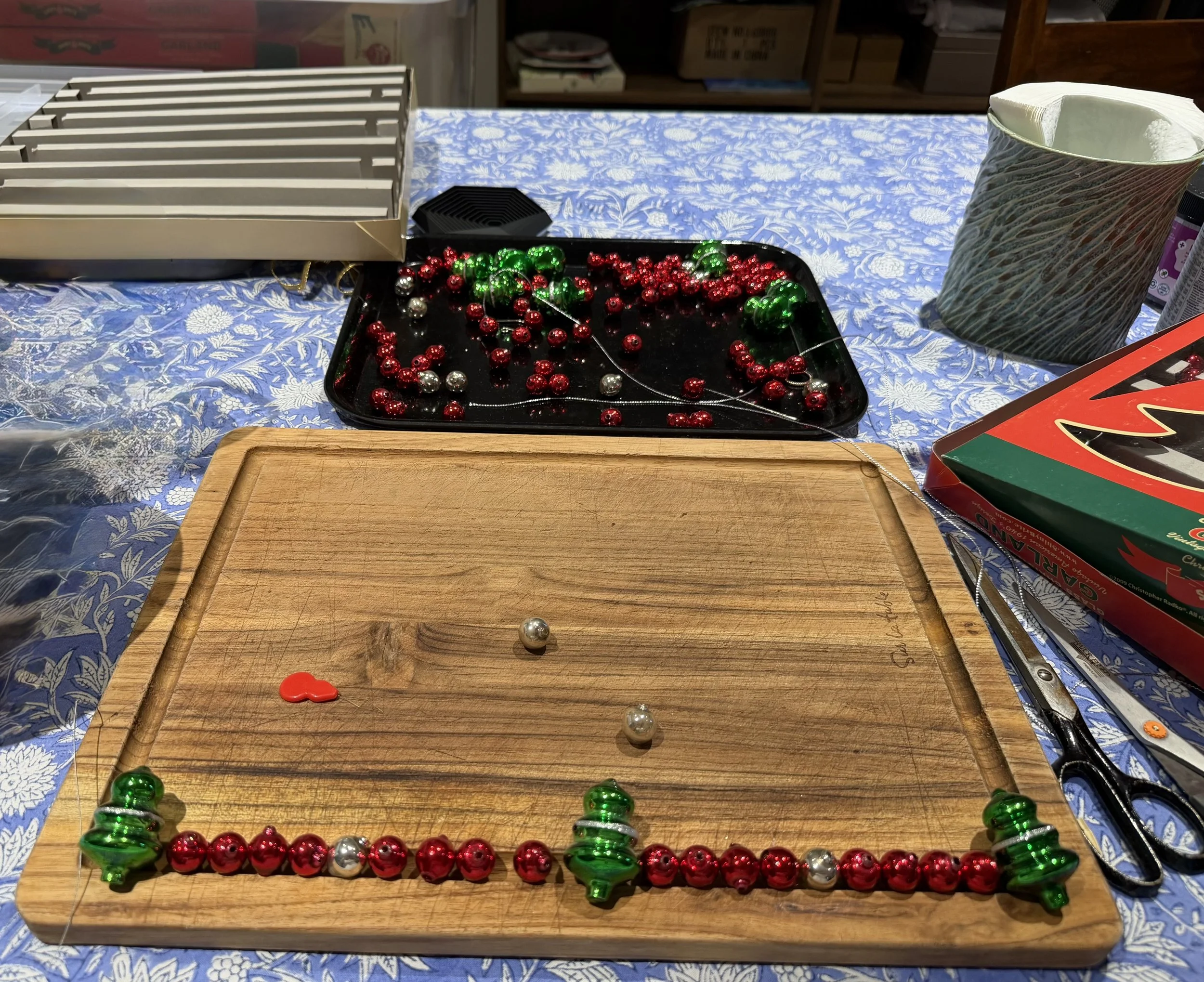 I bought a special needle for the project, but sadly the wire was too thick for it. In the end I just used a chopping board with a juice channel around it, to hold the glass bulbs. Then I proceeded to feed the wire through each piece. The tricky part for me was tying the curly end hooks to the wire. I think i have about three triple knots done on each end and several single knots. What I didn’t think about was purchasing clamps to clamp down on the wire. Before they go onto the tree next year, I plan on also closing of looped wire of the curly hooks to prevent the line sliding off the hook. Sadly, I went from 11 boxes purchase over the last 20+ years down to just 10. There has been so much breakage over the last two decades, I had to reduce the lengths of some, and try to fill in for really short strands. There is on strand, that lost so much, I only really have 1/3 of the glass ball left. I think eventually that strand will be used to repopulate other strands.